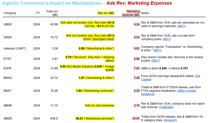 营销费用流向的问题。在Freda的分析框架中,营销费用最终都流向”漏斗顶端”,无论是以广告支出还是平台抽成的形式。但有一个更微妙的问题常被忽视:来自直接流量的广告收入会去哪里?如果agenticcommerce将越来越多的流量从直接转向间接,那些依赖站内广告盈利的平台(比如Booking、Expedia、Etsy)会失去这部分高利润收入。这不仅仅是利润的减少,而是商业模式的根本性破坏。