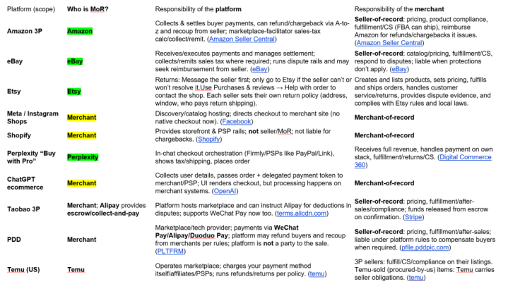 中间地带更有意思。Etsy和eBay是平台作为MoR(集中支付),但在退货方面,买家首先联系卖家,如果2-3天内没有回应,平台才介入。淘宝和拼多多则是商家作为MoR,但平台高度参与,提供托管服务和支付代收,并调解纠纷。我认为这些中间模式其实代表了不同市场环境下的妥协方案,它们试图在控制力和灵活性之间找到平衡点。