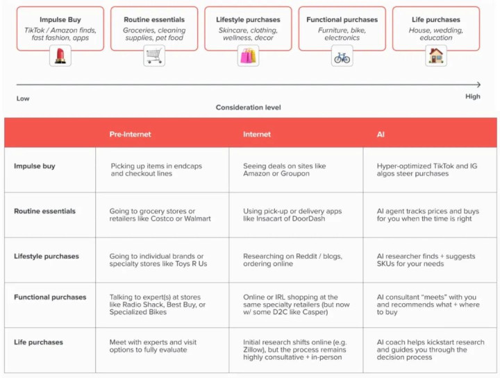 Freda在她的分析中引用了a16z合伙人AlexRampell的框架,将消费分为三大类:冲动购买(ImpulseBuys)、日常必需品(RoutineEssentials)和重大人生购买(LifePurchases)。这个分类看似简单,但却直击agenticcommerce的核心问题:AIagent到底适合处理哪类购物场景?我认为这是一个被严重低估的关键问题。很多人在讨论AIagent购物时,都假设它可以处理所有类型的购买,但实际上不同类别的购买有着截然不同的决策逻辑和信任要求。(可以看之前的文章《a16z最新洞察|传统电商已死?AI原生平台正在重新定义”购物”这件事》)