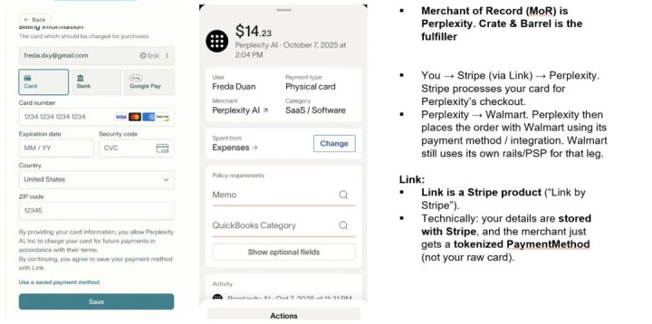 相比之下,Perplexity选择了一条更艰难的路。在“BuywithPro”中,Perplexity充当MoR,而Walmart(商家)只是履行者。这意味着Perplexity承担了比OpenAI多得多的责任。流程是:资金先通过Perplexity,Stripe(通过Link)为Perplexity的结账处理你的信用卡,然后Perplexity使用Walmart的PSP向Walmart下单。对商家来说,如果你关心拥有支付、税务、退款、欺诈、CRM和第一方数据的所有权,同时仍然获得agentic分发,那么ACP更好。对平台来说,ChatGPT的方法更容易扩展,因为它几乎不承担任何责任。