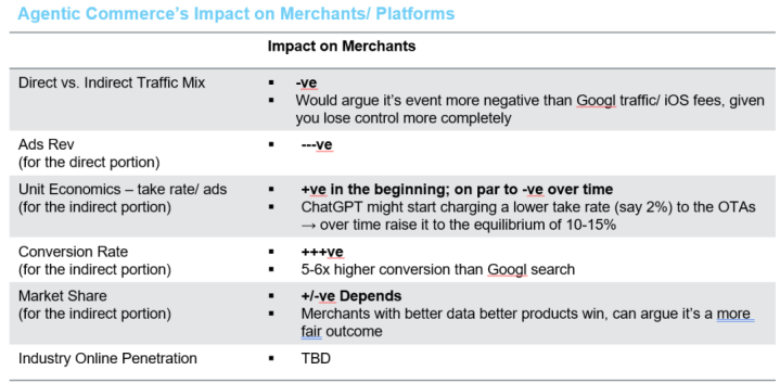 还可以注意到很多卖方分析师在预测,agenticcommerce的采用将提高行业的在线渗透率。他们的逻辑是:更便捷的购物体验会吸引更多人在线购物。但我对这个逻辑持保留态度。在线渗透率的提高通常受限于产品特性(某些商品必须线下体验)和人口结构(老年人的数字化程度),而不是购物流程的便捷性。agenticcommerce更可能是重新分配现有在线市场的份额,而不是显著扩大整个市场。