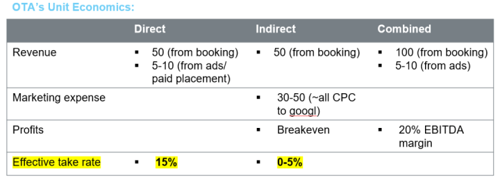让我们先看Booking和Expedia的现状。这两家全球最大的在线旅游平台,大约一半的预订和流量是直接的,另一半是间接的(主要通过Google)。表面上看,这似乎是一个健康的平衡。但当你深入研究单位经济效益时,会发现一个残酷的真相:对于间接流量部分,这些公司基本上只是收支平衡,因为他们向Google支付的每次点击成本(CPC)非常高。